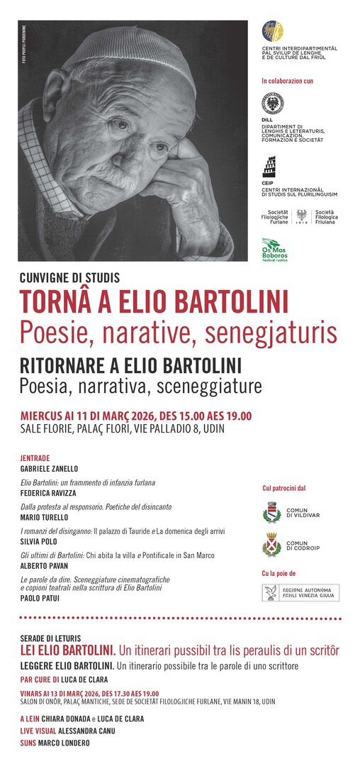 Te suaze de cunvigne e je previodude ancje une serade di leturis: Lei Elio Bartolini. Un itinerari pussibil tra lis peraulis di un scritôr par cure di Luca de Clara, vinars ai 13 di Març 2026, des 17.30 aes 19.00 tal Salon di Onôr di Palaç Mantiche, sede de Societât Filologjiche Furlane, Vie Manin 18, Udin.