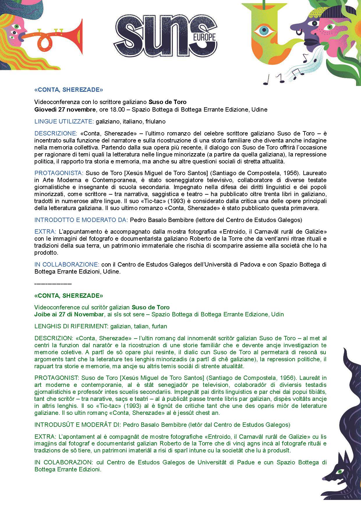 DESCRIZIONE: «Conta, Sherezade» – l’ultimo romanzo del celebre scrittore galiziano Suso de Toro – è incentrato sulla funzione del narratore e sulla ricostruzione di una storia familiare che diventa anche indagine nella memoria collettiva. Partendo dalla sua opera più recente, il dialogo con Suso de Toro offrirà l’occasione per ragionare di temi quali la letteratura nelle lingue minorizzate (a partire da quella galiziana), la repressione politica, il rapporto tra storia e memoria, ma anche su altre questioni sociali di stretta attualità.